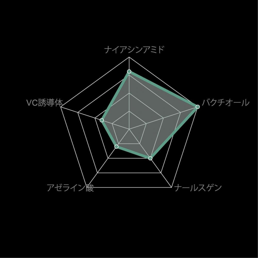 水、イソステアリン酸オクチルドデシル、グリセリン、DPG、ペンチレングリコール、ヘキサ(ヒドロキシステアリン酸/ステアリン酸/ロジン酸)ジペンタエリスリチル、ステアリン酸グリセリル、ラウリン酸ポリグリセリル−10、カルボキシメチルフェニルアミノカルボキシプロピルホスホン酸メチル、ナイアシンアミド、バクチオール、ヒアルロン酸Na、ブドウ果実細胞エキス、プランクトンエキス、アゼライン酸、パルミトイルペンタペプチド−4、アスコルビルグルコシド、セイヨウハッカ葉エキス、イソマルト、カルボマー、トリ(カプリル酸/カプリン酸)グリセリル、BG、レシチン、(アクリル酸ヒドロキシエチル/アクリロイルジメチルタウリンNa)コポリマー、トコフェロール、ベヘニルアルコール、ポリソルベート20、フェノキシエタノール、香料